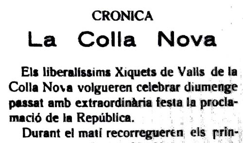No admitir para las "Collas" que puedan estar bajo este Patronato ninguna denominación de nueva o de vieja, consecuentes a lo expuesto y para evitar posibles rivalidades ajenas a la índole de los "Xiquets". (...) (14) És a dir, esquerres-dretes.