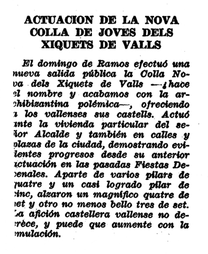 "El domingo pasado,15-9-1946 algunos elementos pertenecientes a la Colla dels Xiquets de Valls y con otros jóvenes entusiastas de los mismos ¿futuros castellers? se trasladaron a Cabra levantando el tres i quatre de set, dos de sis i pilar de cinc, siendo muy aplaudidos" (10) Clar, la premsa al veure castellers grans que alguns coneixien van escriure la Colla dels Xiquets de Valls perquè no tenien nom oficial i no sabien com anomenar-los quan, a més, no va ser d'aquesta manera tot menystenint als joves entusiastes que no coneixia ningú i que eren els fundadors d'aquesta colla.